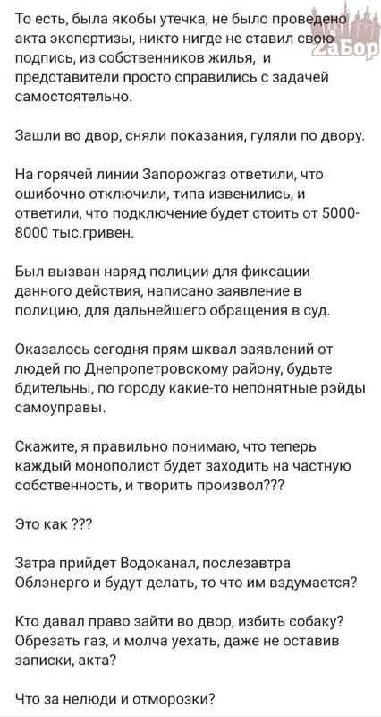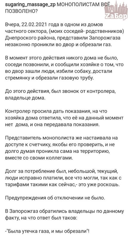 Инцидент произошел вчера, 22 февраля. В один из домов частного сектора, который расположен в Днепровском районе, представители "Запорожгаза" зашли во двор и обрезали газ. В этот момент дома никого не было. Соседи позвонили хозяйке дома и сообщили о том, что в двор вошли люди, избили собаку, достали стремянку и обрезали газовую трубу. Об это стало известно в соцсети .