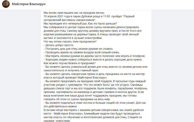 В парке отдыха "Дубовая роща" 10 апреля пройдет 4 фестиваль скворечников. Об этом стало известно на странице Фейсбук "Майстерня Власноруч".