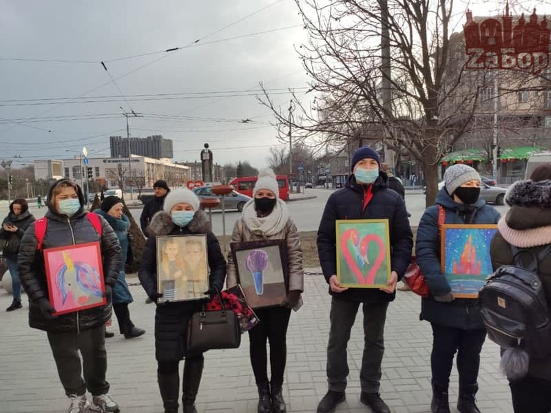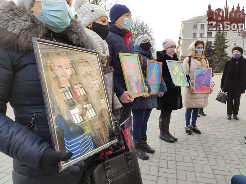 На митинг пришли родственники и друзья Ани. Они выстроились в линию с картинами девочки, которые она рисовала.