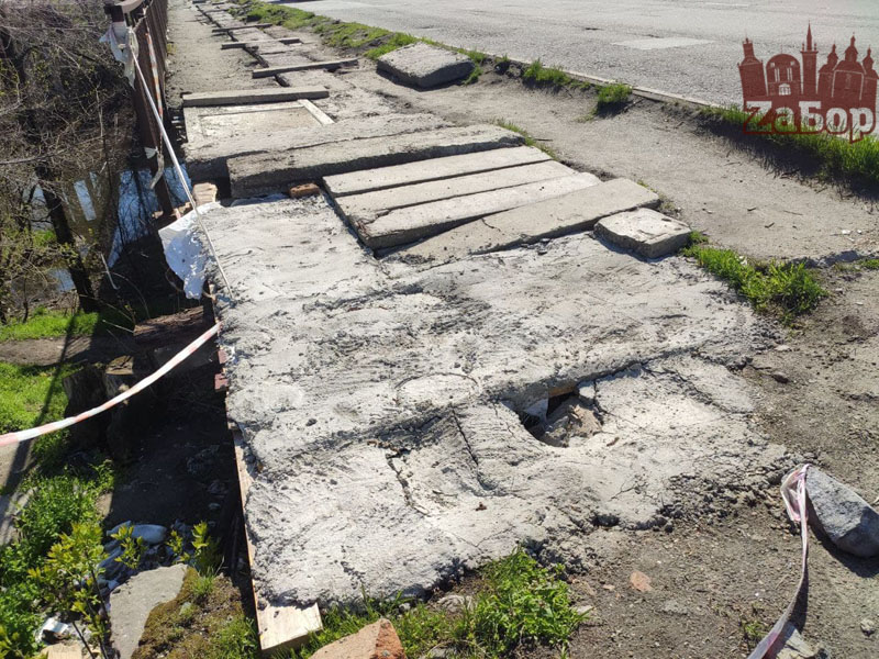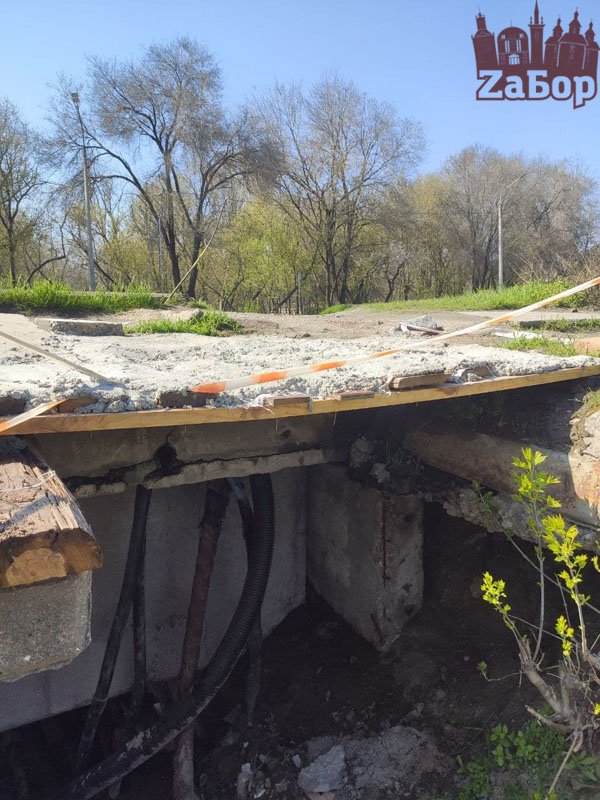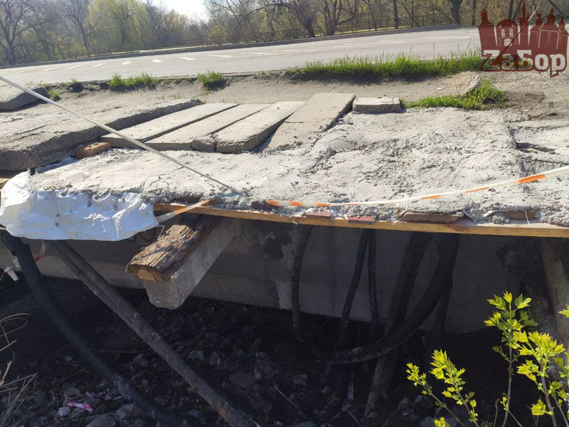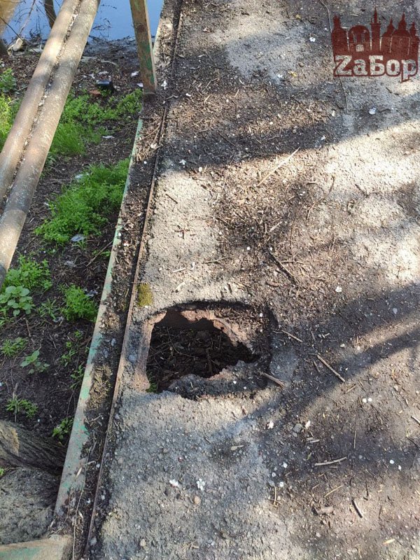 Так, большой провал закрыли 1-2 слоем досок, а сверху засыпали цементом. При этом, его даже ничем не оградили, а под мостом продолжают торчать ничем не прикрытые трубы. Также тут натянули сигнальную ленту, которая привязана к краю старых перил.