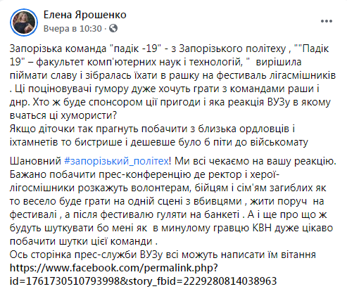 Также, волонтер обратилась к пресс-службе "политехники", с заявлением, что все ожидают реакции университета. Елена Ярошенко отметила, что желательно увидеть пресс-конференцию где ректор и команда, расскажут волонтерам, бойцам и семьям погибшим як будут играть на одной сцене с убийцами, а после фестиваля гулять на банкете.