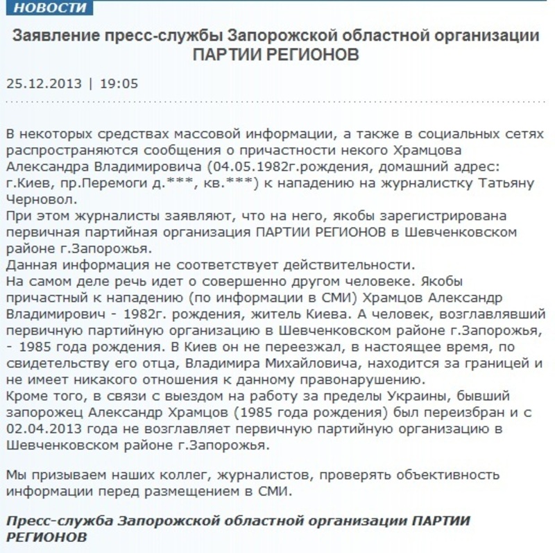 "В некоторых средствах массовой информации, а также в социальных сетях распространяются сообщения о причастности некого Храмцова Александра Владимировича (04.05.1982г.рождения, домашний адрес: Киев, пр. Победы д.***, кв.***) к нападению на журналистку Татьяну Черновол.