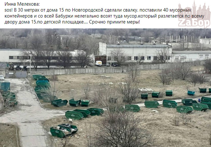 В соцсети местная жительница Инна Мелихова пишет о том, что в 30 метрах от дома №15 по улице Новгородская сделали свалку. Потек мнению, сюда нелегально свозят мусор со всей Бабурки. Также женщина отмечает, что мусор разлетается не только по всему двору дома, но и по детской площадке.