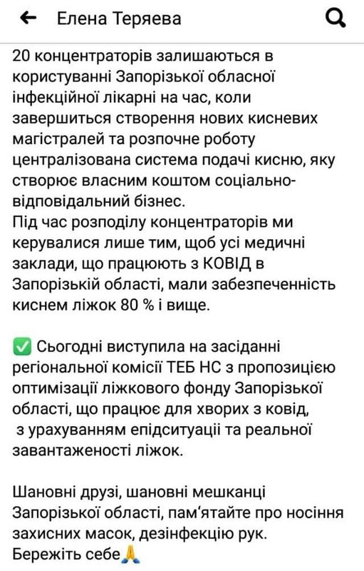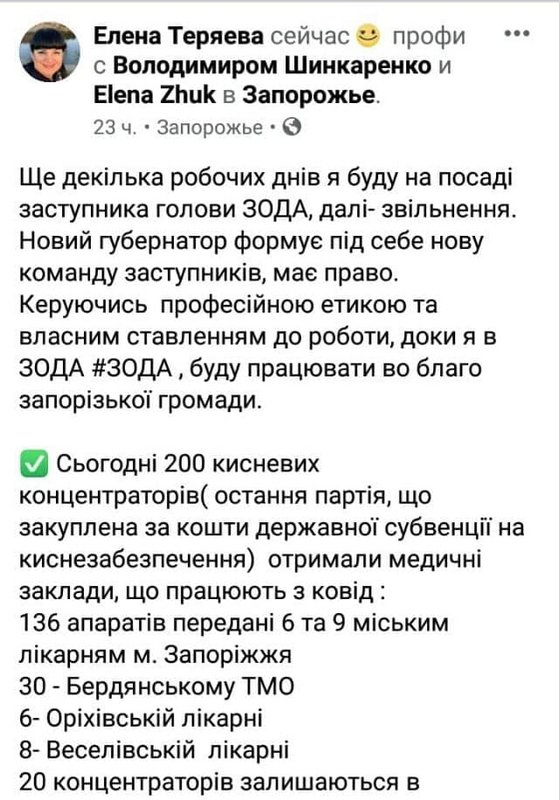 За период работы на должности Елена Теряева смогла обеспечить больницы Запорожья и области, которые работают с ковидом - кислородом. Сегодня еще 200 кислородных концентратов получили: