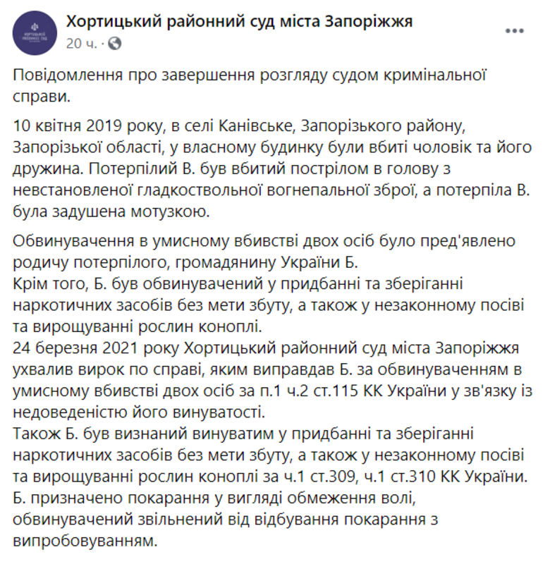 24 марта 2021 Хортицкий районный суд Запорожья принял приговор по делу, который оправдал подозреваемого в умышленном убийстве двух человек согласно п. 1 ч. 2 ст. 115 ККУ в связи с недоказанностью его виновности. Об этом сообщают в пресс-службе суда.