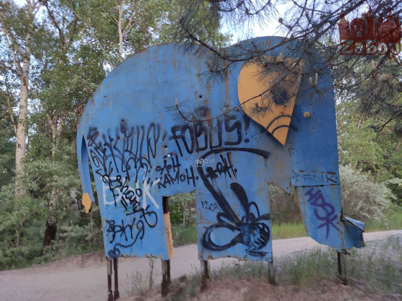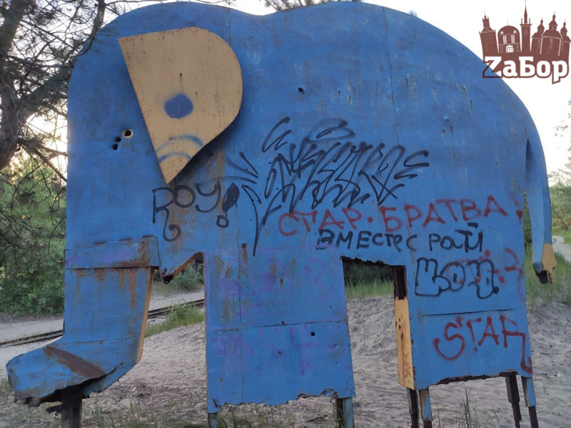 На Гребном канале возле колеи детской железной дороги установлены железные фигуры животных. Установили конструкции еще в советские годы. Несколько фигур уже свалили, остальные обрисовывают, также местами они уже проржавели. А теперь еще одна фигура стала мишенью для местных стрелков.