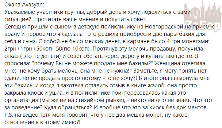 В группе "Бабурка Антивирусная" Оксана Авасян рассказала, что 11 марта она вместе с сыном пришла в детскую поликлинику, которая находится на улице Новгородская Хортицкого района города. Перед приемом у врача женщина решила приобрести бахилы в киоске, который находится в поликлинике. Так, как у нее не было с собой мелких денег, а были только 4 гривны монетами: 2грн+1грн+50коп+ 50коп (по 10 коп), этой мелочью она и решила рассчитаться за бахилы.