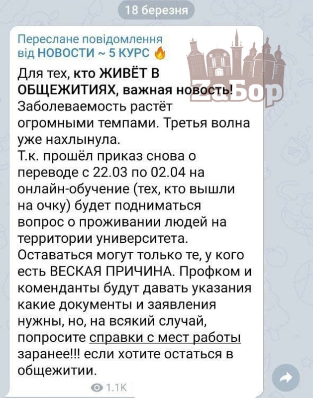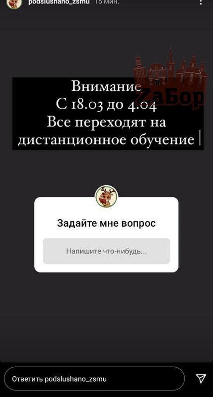 Как, ранее писал "ZаБору", вчера, 18 марта, студентам-медикам сообщили, что с 22 марта по 4 апреля их обучение переходит на дистанционный формат. При этом в чате студентам сообщили, что уже прямо с 18 марта начинается переход на "дистанционку". Однако сегодня было принято несколько иное решение: студентов 1-х и 2-х курсов, а также выпускной 6-й курс оставить на очной форме обучения, а 3-й, 4-й, 5-й курсы - отправить на дистанционную форму обучения. Также студенты "пятикурсники" говорят, что находятся на "дистанционке" с начала года. Неофициально связывают это с тем, что студентам этих курсов приходится много ездить по медучреждениям города, для получения практических знаний и навыков, и риск "подхватить" коронавирус у них выше.