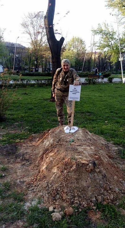 В Запорожье уже который день длится эпопея со строительством торгово-развлекательного центра в сквере им. Яланского. На этот раз, активисты насыпали кучу земли, напоминающую могилу, установив на ней табличку с надписью "Он хотел уничтожить парк", сообщает "ZаБор".