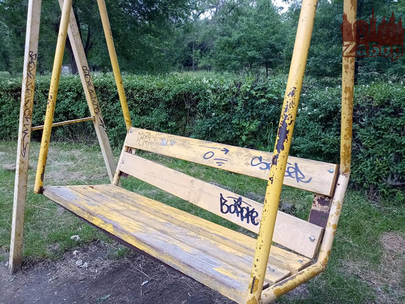 Также Евгения поделилась и фото одной из качель, которые установлены в парке. На фото видно, что все качели разрисованы граффити, с них облазит краска и отпадает доска на спинке. К слову, такая картина, наблюдается на всех качелях в парке.