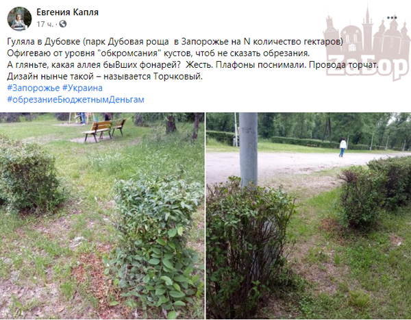 В соцсети Фейсбук запорожанка Евгения Капля поделилась постом, в котором рассказала, что в парке отдыха "Дубовая роща" в Запорожье безобразно обрезали кусты, а с фонарей поснимали плафоны, сообщает "ZаБор".