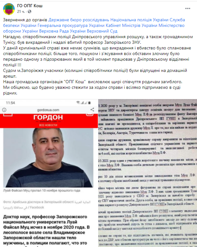 На официальной странице общественной организации Кош сообщают о том, что несколько сотрудников полиции Днепровского управления розыска, а также гражданином Туниса, был похищен и убит профессор запорожского университета. Помимо этого, указывается, что по данному делу уже нет сомнений, что похищение и убийство было спланированно сотрудниками полиции, кроме того, поиском и выяснением всех обстоятельств занимался один из подозреваемых, который на тот момент работал в Днепровском отделении полиции.