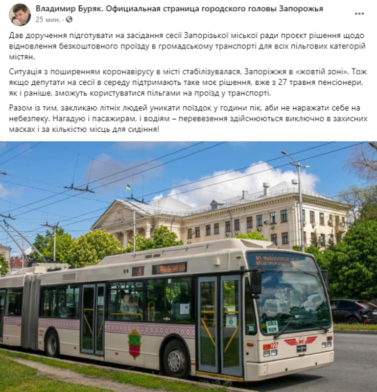 20 мая на официальной странице в Фейсбук мэр Запорожья Владимир Буряк сообщил, что будет подготовлен соответствующий проект решения, согласно которому, вернут бесплатный проезд в общественном транспорте для всех льготных категорий граждан.