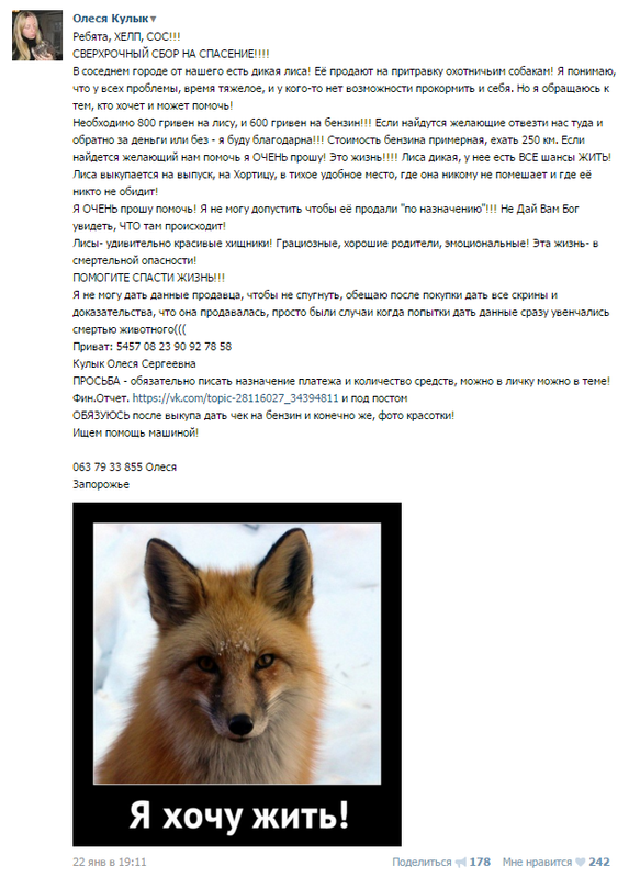 Запорожский зооволонтер, Олеся Кулык, разместила у себя в профиле социальных сетей сообщение о том, что животному необходима помощь. На этот раз помогать нужно лисе. Рыжая красавица попалась на воровстве куриц. Тогда, хозяин птиц словил воровку. Мужчина собирался лису продать в охотничьи угодья, где дикое животное использовали бы в качестве притравки. И, чтоб ее спасти от верной гибели, ее необходимо выкупить. Помимо финансов на выкуп, необходимы деньги, так же, на проезд.