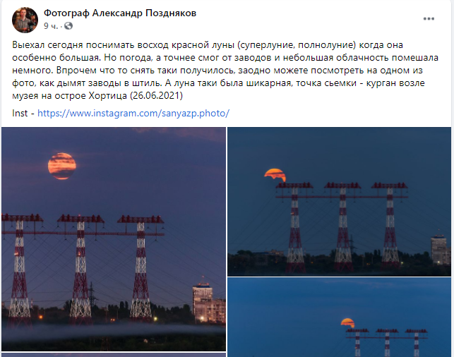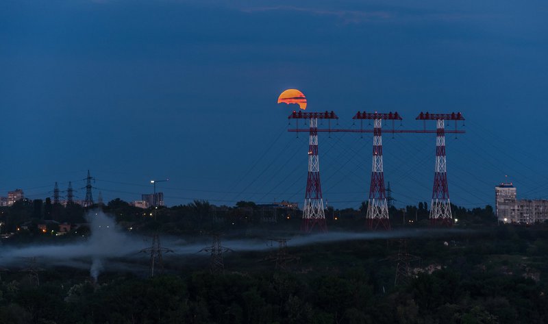Как пишет Александр Поздняков, съемке немного помешал городской смог и небольшая облачность. Снимки фотограф делал с кургана Единства, который находится возле Музея истории запорожского казачества на Хортице.