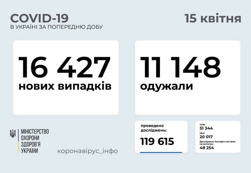 16 427 новых случаев коронавирусной болезни COVID-19 зафиксировано в Украине по состоянию на 15 апреля 2021 года. В частности, заболели 628 детей и 383 медработника. В Запорожской области зарегистрировано 1 015 новых случая на COVID-19. Всего состоянием на 15 апреля 2021 зарегистрировано 87 954 лабораторно подтвержденных случаев. В том числе: 4623 – среди детей (47 за сутки) и 4665 среди медработников (34 за сутки). Такие данные передает МОЗ и Запорожский лабораторный центр. Подробнее – "ZаБор".