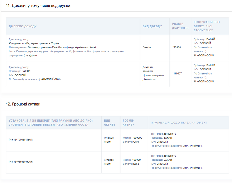 За 2020 год Алексей Бакай получил пенсию в размере 120 тысяч гривен и более 1 миллиона гривен дохода от бизнеса. Также он имеет наличности в размере 1 миллион гривен и 100 тысяч евро.