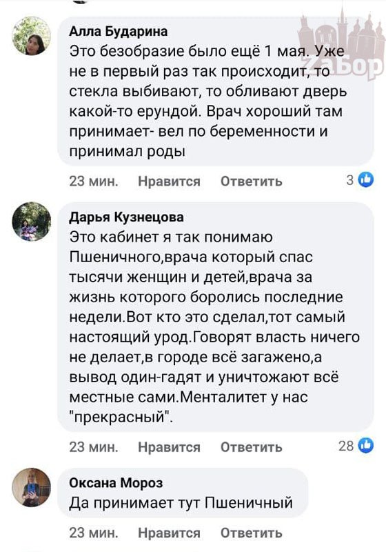 Также местные жители пишут, что это кабинет доктора Пшеничного, и отмечают, что врач очень хороший, спаси тысячи женщин и детей. Кроме этого, горожане пишут, что местная власть ничего не делает.