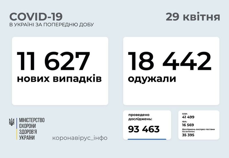 11 627 новых случаев коронавирусной болезни COVID-19 зафиксировано в Украине по состоянию на 29 апреля 2021 года. В частности, заболели 518 детей и 259 медработников. В Запорожской области зарегистрировано 547 новых случая на COVID-19. Всего состоянием на 29 апреля 2021 зарегистрировано 95 406 лабораторно подтвержденных случаев. В том числе: 4903 – среди детей (20 за сутки) и 4851 среди медработников (11 за сутки). Такие данные передает МОЗ и Запорожский лабораторный центр. Подробнее – "ZаБор".