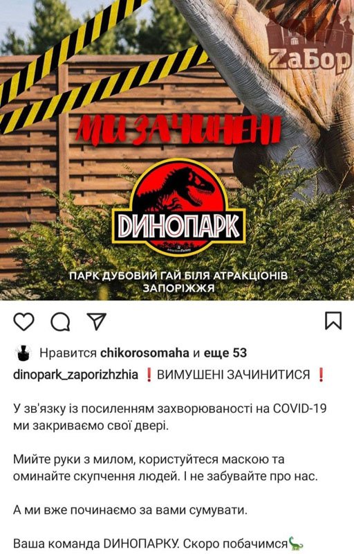 На официальной странице в соцсети запорожского "Динопарка" сообщили о том, что развлекательный центр закрывается на карантин. При этом в Мелитополе, где собирались ужесточать карантинные меры "Динопарк" продолжает работать, причем со скидками на групповое посещение, передает "ZаБор".