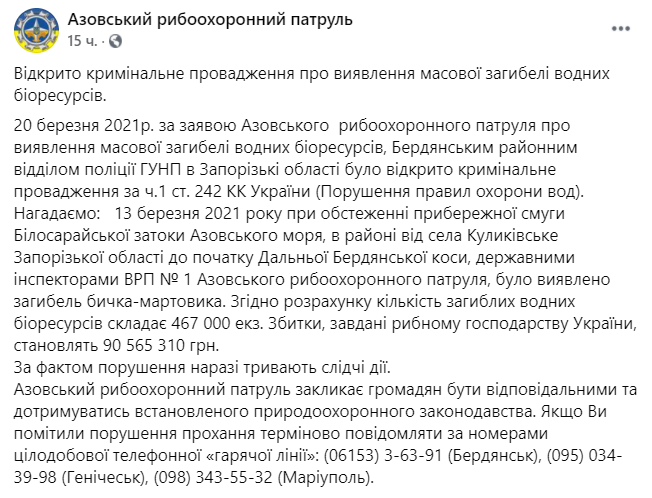 20 марта 2021 года Азовский рыбоохранный патруль подал заявление о выявлении массовой гибели рыбы. Бердянским районным отделением полиции было открыто уголовное производство по ч.1 ст. 242 ККУ – "Нарушение правил охраны вод".