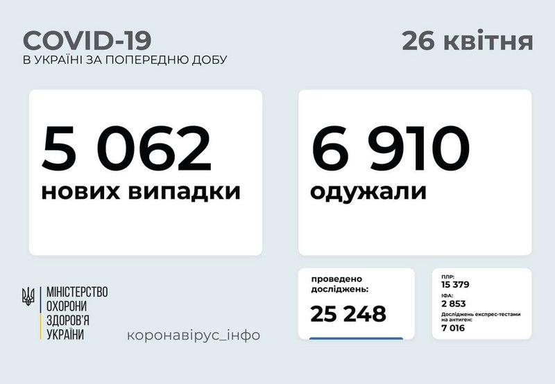 5 062 новых случаев коронавирусной болезни COVID-19 зафиксировано в Украине по состоянию на 26 апреля 2021 года. В частности, заболели 221 ребенок и 54 медработников. В Запорожской области зарегистрировано 135 новых случая на COVID-19. Всего состоянием на 26 апреля 2021 зарегистрировано 93 821 лабораторно подтвержденных случаев. В том числе: 4845 – среди детей (2 за сутки) и 4804 среди медработников (2 за сутки). Такие данные передает МОЗ и Запорожский лабораторный центр. Подробнее – "ZаБор".