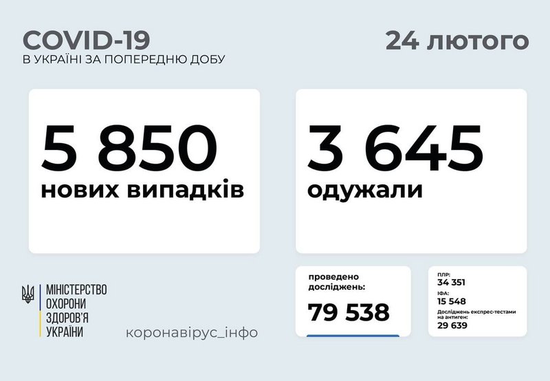 5850 новых случаев коронавирусной болезни COVID-19 зафиксировано в Украине по состоянию на 24 февраля 2021 года. В частности, заболели 316 детей и 271 медработников.В Запорожской области зарегистрировано 156 новых случаев на COVID-19. Всего состоянием на 24 февраля зарегистрировано 69 086 лабораторно подтвержденных случаев. В том числе: 3655 – среди детей (9 за сутки) и 4011 среди медработников (2 за сутки). Такие данные передает МОЗ и Запорожский лабораторный центр. Подробнее – "ZаБор".
