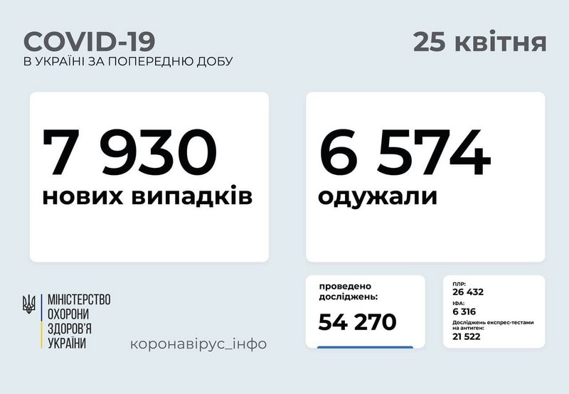7 930 новых случаев коронавирусной болезни COVID-19 зафиксировано в Украине по состоянию на 25 апреля 2021 года. В частности, заболели 331 ребенок и 98 медработников. В Запорожской области зарегистрировано 252 новых случая на COVID-19. Всего состоянием на 25 апреля 2021 зарегистрировано 93 686 лабораторно подтвержденных случаев. В том числе: 4843 – среди детей (2 за сутки) и 4802 среди медработников (3 за сутки). Такие данные передает МОЗ и Запорожский лабораторный центр. Подробнее – "ZаБор".