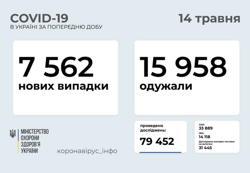 7 562 новых случаев коронавирусной болезни COVID-19 зафиксировано в Украине по состоянию на 14 мая 2021 года. В частности, заболели 366 детей и 216 медработников. В Запорожской области зарегистрировано 300 новых случая на COVID-19. Всего состоянием на 14 мая 2021 зарегистрировано 99 523 лабораторно подтвержденных случаев. В том числе: 5066 – среди детей (14 за сутки) и 4941 среди медработников (10 за сутки). Такие данные передает МОЗ и Запорожский лабораторный центр. Подробнее – "ZаБор".