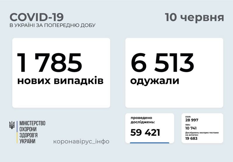 1 785 новых случаев коронавирусной болезни COVID-19 зафиксировано в Украине по состоянию на 10 июня 2021 года. В частности, заболели 77 детей и 73 медработника. В Запорожской области зарегистрировано 30 новых случаев заболевания COVID-19. Всего состоянием на 10 июня 2021 зарегистрировано 103 810 лабораторно подтвержденных случаев. В том числе: 5283 – среди детей (1 за сутки) и 5022 среди медработников (2 за сутки). Такие данные передает МОЗ и Запорожский лабораторный центр. Подробнее – "ZаБор".