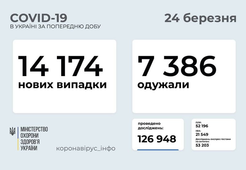 14 174 новых случаев коронавирусной болезни COVID-19 зафиксировано в Украине по состоянию на 24 марта 2021 года. В частности, заболели 750 детей и 434 медработников. В Запорожской области зарегистрировано 603 новых случая на COVID-19. Всего состоянием на 24 марта 2021 зарегистрировано 75 392 лабораторно подтвержденных случаев. В том числе: 3996 – среди детей (49 за сутки) и 4239 среди медработников (20 за сутки). Такие данные передает МОЗ и Запорожский лабораторный центр. Подробнее – "ZаБор".