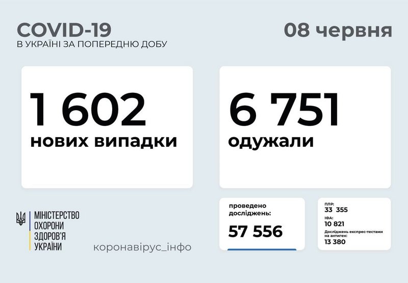 1 602 новых случаев коронавирусной болезни COVID-19 зафиксировано в Украине по состоянию на 08 июня 2021 года. В частности, заболели 95 детей и 64 медработника. В Запорожской области зарегистрировано 90 новых случаев заболевания COVID-19. Всего состоянием на 08 июня 2021 зарегистрировано 103 737 лабораторно подтвержденных случаев. В том числе: 5280 – среди детей (5 за сутки) и 5018 среди медработников (0 за сутки). Такие данные передает МОЗ и Запорожский лабораторный центр. Подробнее – "ZаБор".
