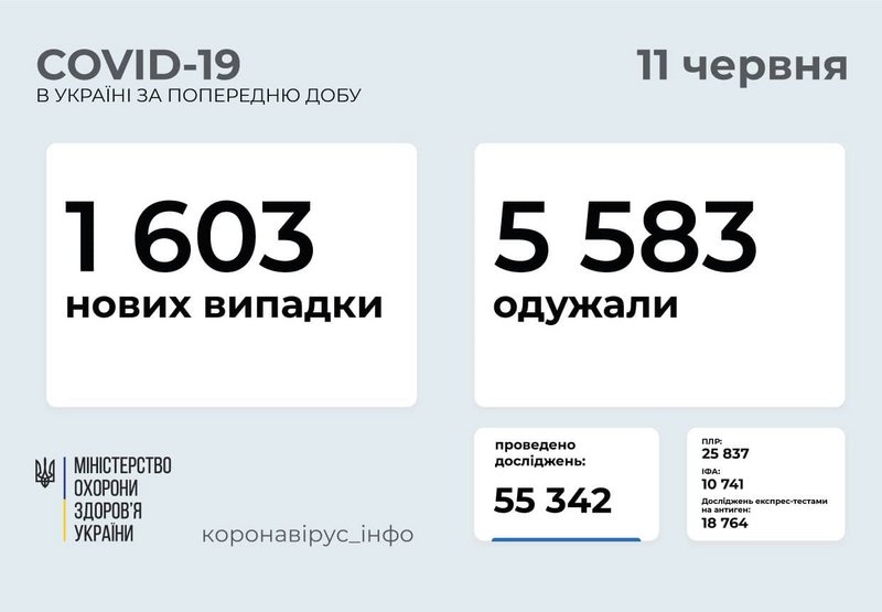 1 603 новых случаев коронавирусной болезни COVID-19 зафиксировано в Украине по состоянию на 11 июня 2021 года. В частности, заболели 75 детей и 72 медработника. В Запорожской области зарегистрировано 97 новых случаев заболевания COVID-19. Всего состоянием на 11 июня 2021 зарегистрировано 103 907 лабораторно подтвержденных случаев. В том числе: 5284 – среди детей (1 за сутки) и 5024 среди медработников (2 за сутки). Такие данные передает МОЗ и Запорожский лабораторный центр. Подробнее – "ZаБор".