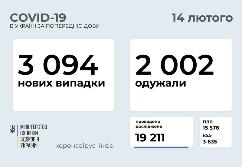 3 094 новых случаев коронавирусной болезни COVID-19 зафиксировано в Украине по состоянию на 14 февраля 2021 года. В частности, заболели 183 ребенка и 72 медработников. В Запорожской области зарегистрировано 34 новых случаев на COVID-19. Всего состоянием на 14 февраля зарегистрировано 67 002 лабораторно подтвержденных случаев. В том числе: 3591– среди детей (0 за сутки) и 3950 среди медработников (0 за сутки). Такие данные передает МОЗ и Запорожский лабораторный центр. Подробнее – "ZаБор".