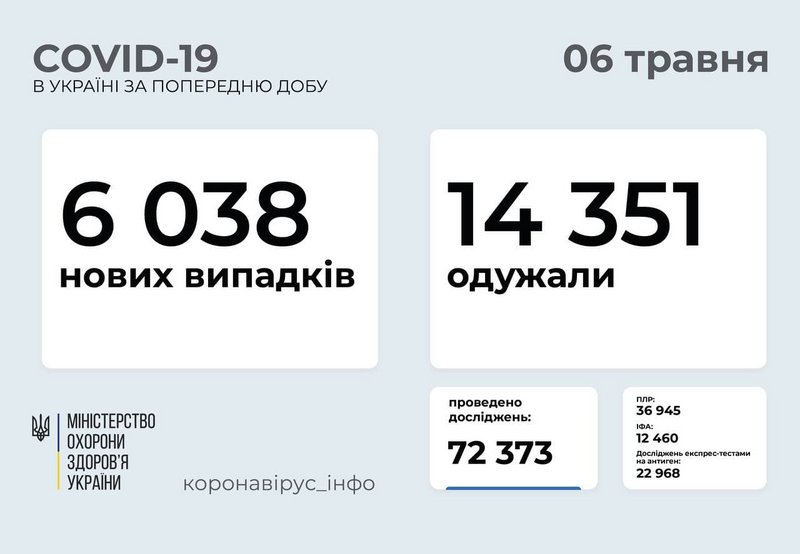 6 038 новых случаев коронавирусной болезни COVID-19 зафиксировано в Украине по состоянию на 06 мая 2021 года. В частности, заболели 271 ребенок и 133 медработников. В Запорожской области зарегистрировано 356 новых случая на COVID-19. Всего состоянием на 06 мая 2021 зарегистрировано 97 243 лабораторно подтвержденных случаев. В том числе: 4983 – среди детей (8 за сутки) и 4885 среди медработников (3 за сутки). Такие данные передает МОЗ и Запорожский лабораторный центр. Подробнее – "ZаБор".