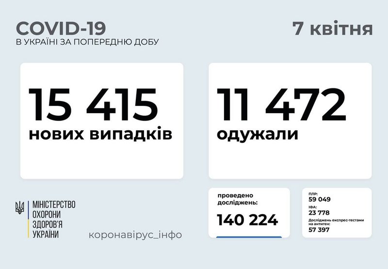 15 415 новых случаев коронавирусной болезни COVID-19 зафиксировано в Украине по состоянию на 07 апреля 2021 года. В частности, заболели 636 детей и 437 медработников. В Запорожской области зарегистрировано 730 новых случая на COVID-19. Всего состоянием на 07 апреля 2021 зарегистрировано 82 487 лабораторно подтвержденных случаев. В том числе: 4366 – среди детей (45 за сутки) и 4489 среди медработников (27 за сутки). Такие данные передает МОЗ и Запорожский лабораторный центр. Подробнее – "ZаБор".