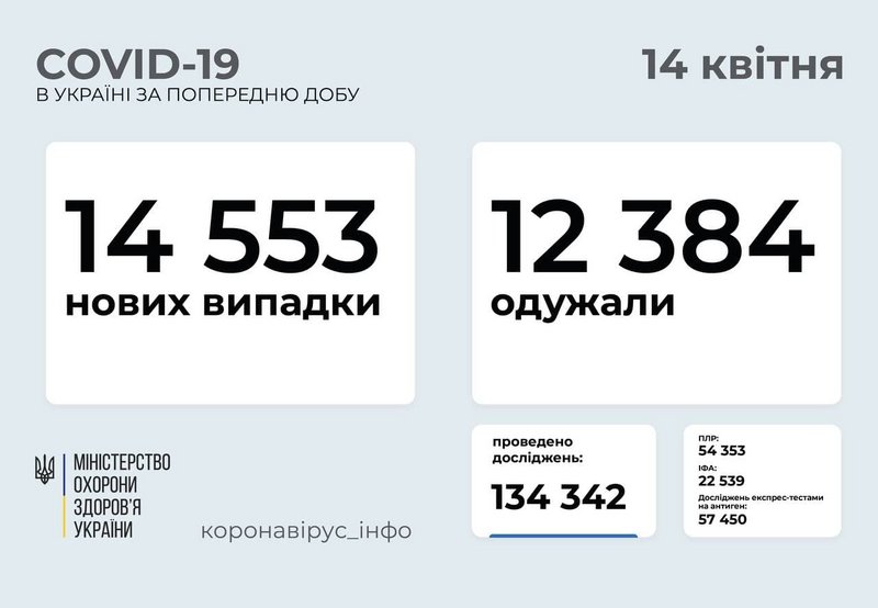 14 553 новых случаев коронавирусной болезни COVID-19 зафиксировано в Украине по состоянию на 14 апреля 2021 года. В частности, заболели 612 детей и 426 медработников. В Запорожской области зарегистрировано 876 новых случая на COVID-19. Всего состоянием на 14 апреля 2021 зарегистрировано 86 939 лабораторно подтвержденных случаев. В том числе: 4576 – среди детей (52 за сутки) и 4631 среди медработников (31 за сутки). Такие данные передает МОЗ и Запорожский лабораторный центр. Подробнее – "ZаБор".