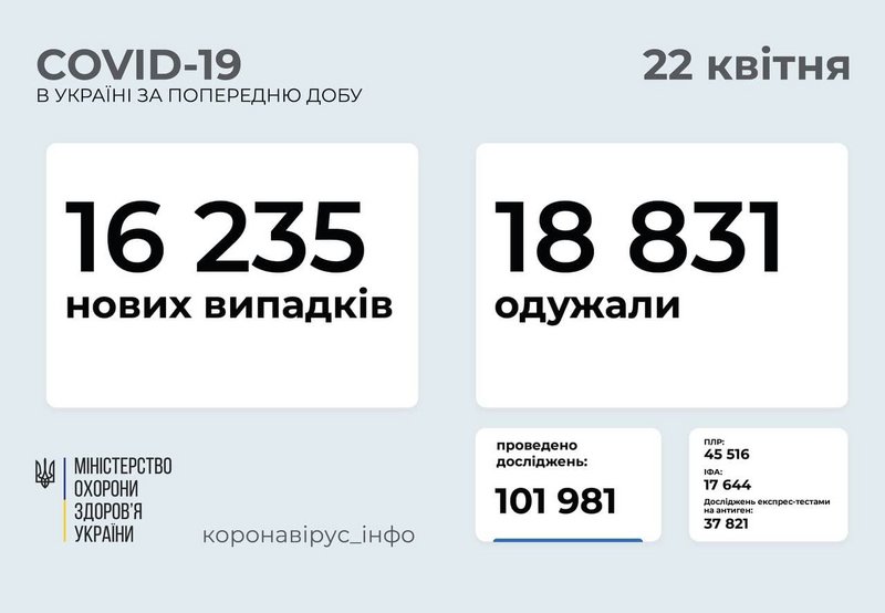 16 235 новых случаев коронавирусной болезни COVID-19 зафиксировано в Украине по состоянию на 22 апреля 2021 года. В частности, заболели 663 ребенка и 319 медработников. В Запорожской области зарегистрировано 998 новых случая на COVID-19. Всего состоянием на 22 апреля 2021 зарегистрировано 91 976 лабораторно подтвержденных случаев. В том числе: 4784 – среди детей (39 за сутки) и 4761 среди медработников (26 за сутки). Такие данные передает МОЗ и Запорожский лабораторный центр. Подробнее – "ZаБор".