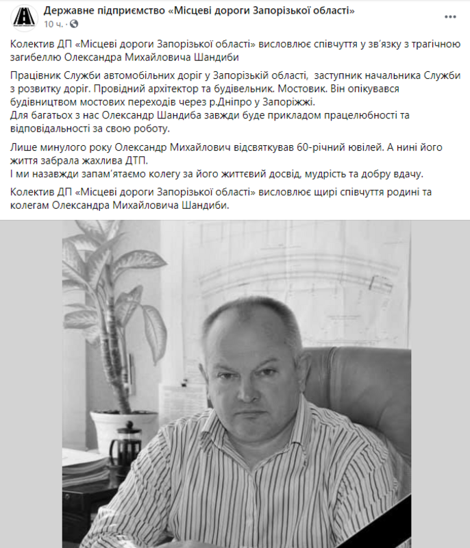 Вчера в аварии погиб заместитель начальника Службы автомобильных дорог в Запорожской области Александр Шандыба. Об этом сообщили на странице Фейсбук ГП "Местные дорогие Запорожской области", передает "ZаБор".