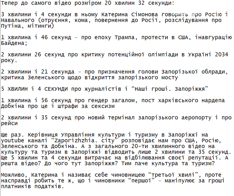 Так, портал "Наші гроші. Запоріжжя" , разобрал поминутно блог, и вот что из этого видно: ролик идет 20 минут, из них 5 минут 4 секунды чиновница говорит о журналистах и "Наші гроші. Запоріжжя", тем самым пытаясь оправдать себя, всего лишь 2 минуты и 35 секунд о новом терминале запорожского аэропорта и рейсах. Остальное время посвящено темам политики.