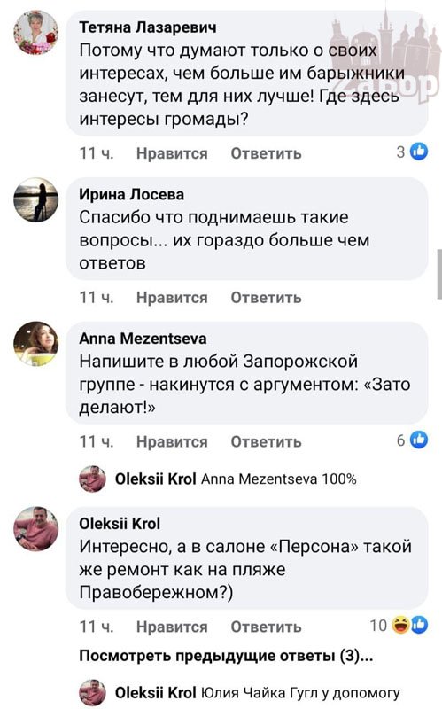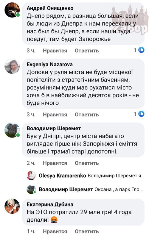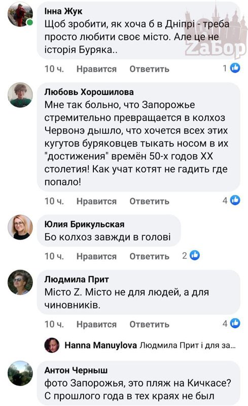 Местные жители также недовольны обновленным пляжем. Так, в комментариях запорожцы пишут, что город превращается в колхоз и Запорожье не для людей, а для чиновников. Также пишут и о том, что "это боль", вокруг развиваются города, а здесь ничего не меняется.