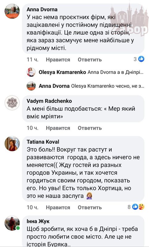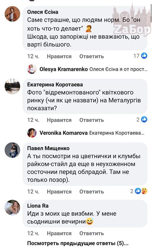Высказали свое мнение и запорожские журналисты. Так, Тарас Белка пишет: "Ну бо є певні діагнози, які не лікуються. Колхобанство це абсолютно клінічний випадок". А Евгения Назарова отметила, что пока городом не будут управлять люди со стратегическим виденьем, то не будет ничего. "Допоки у руля міста не буде місцевої політеліти з стратегічним баченням, розумінням куди має рухатися місто хоча б в найближчий десяток років – не буде нічого", - пишет журналист.
