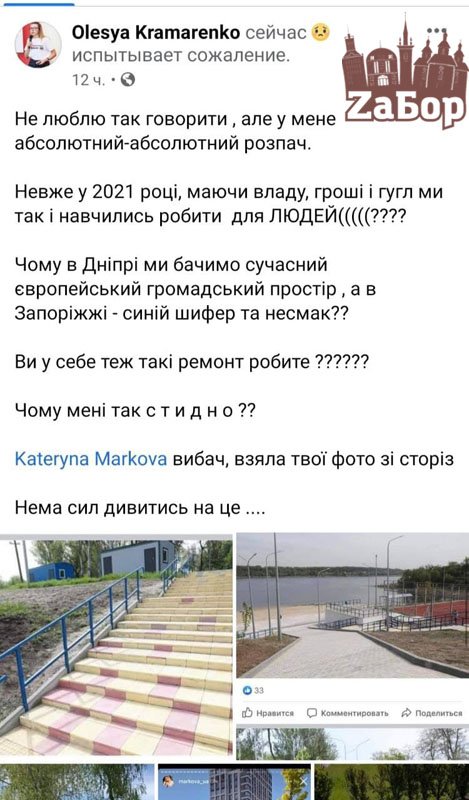 На своей странице в Фейсбук известная общественница и кандидат в мэры Запорожья на последних выборах Олеся Крамаренко опубликовала пост, в котором выразила свое мнение о новом пляже на Кичкасе. Так, Крамаренко пишет "Чому в Дніпрі ми бачимо сучасний європейский простір, а в Запоріжжі синій шифер та несмак? Ви у себе теж такі ремонти робите? Чому мені так стидно?".