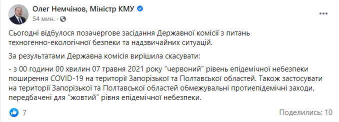 Вместе с Запорожской с 00:00 7 мая из "красной" зоны выйдет и Полтавская область. Об этом на своей странице в Фейсбук сообщил министр КМУ Олег Немчинов.
