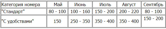 Общая информация: При 2- и 3-местном размещении: 1 спальня, кухня, кондиционер, спутниковое телевидение, холодильник, электроплита, весь необходимый кухонный и уборочный инвентарь. При 4-местном размещении: 1 спальня, кухня, кондиционер, спутниковое телевидение, холодильник, электроплита, весь необходимый кухонный и уборочный инвентарь. При 5- и 6-местном размещении: 2 спальни, кухня, кондиционер, спутниковое