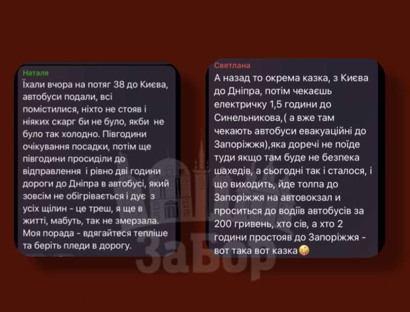 Одна з пасажирок розповіла в коментарях на «ЗаБорі» про поїздку потягом №38 до Києва. За її словами, автобуси до Дніпра справді подали, всі пасажири помістилися, проте умови поїздки були вкрай складними. Людям довелося чекати посадки близько пів години, ще стільки ж – до відправлення, а сама дорога до Дніпра тривала приблизно дві години. При цьому автобус, за словами жінки, був практично без опалення: «Дуло з усіх щілин. Я ще в житті так не змерзала». Пасажирка радить іншим одягатися максимально тепло та брати з собою пледи.