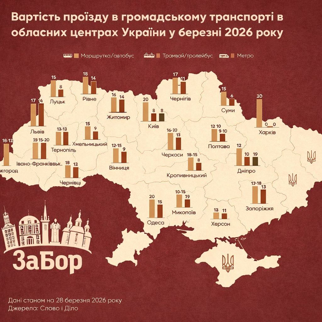 Області центри, де проїзд можна знайти дешевше 10 грн: Харків, Херсон, Миколаїв, Вінниця, Суми, Полтава, Хмельницький, Київ, Кропивницький, Луцьк.
