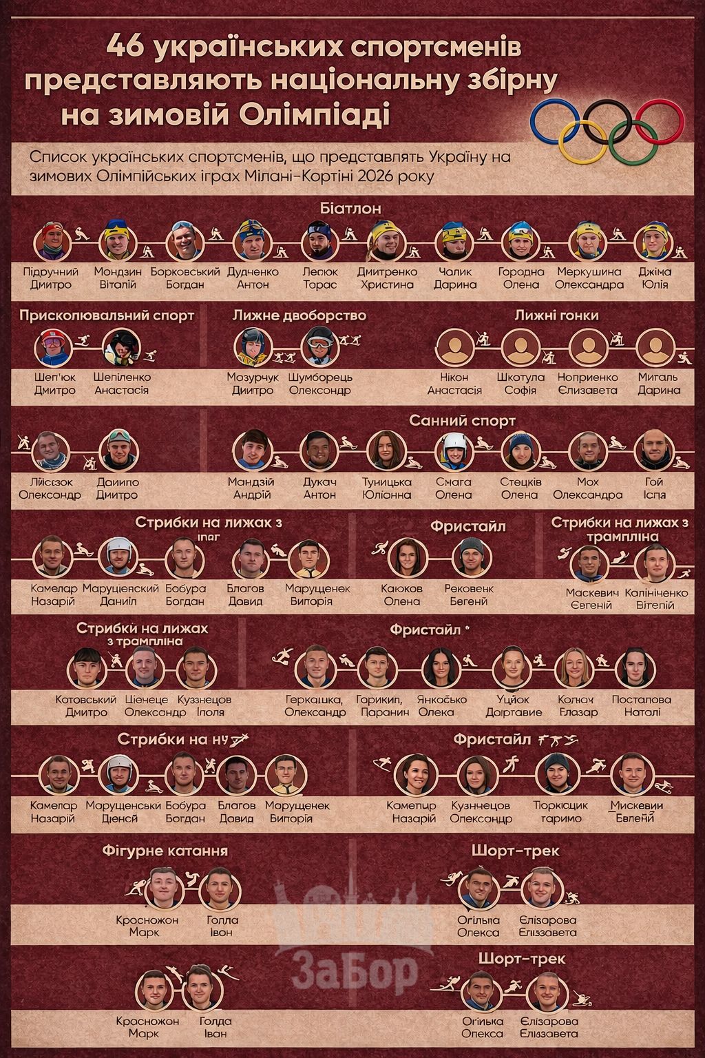 Україну на Олімпіаді-2026 представлятимуть 46 спортсменів, які змагатимуться за нагороди в 11 видах спорту. Запоріжців серед представників України немає.