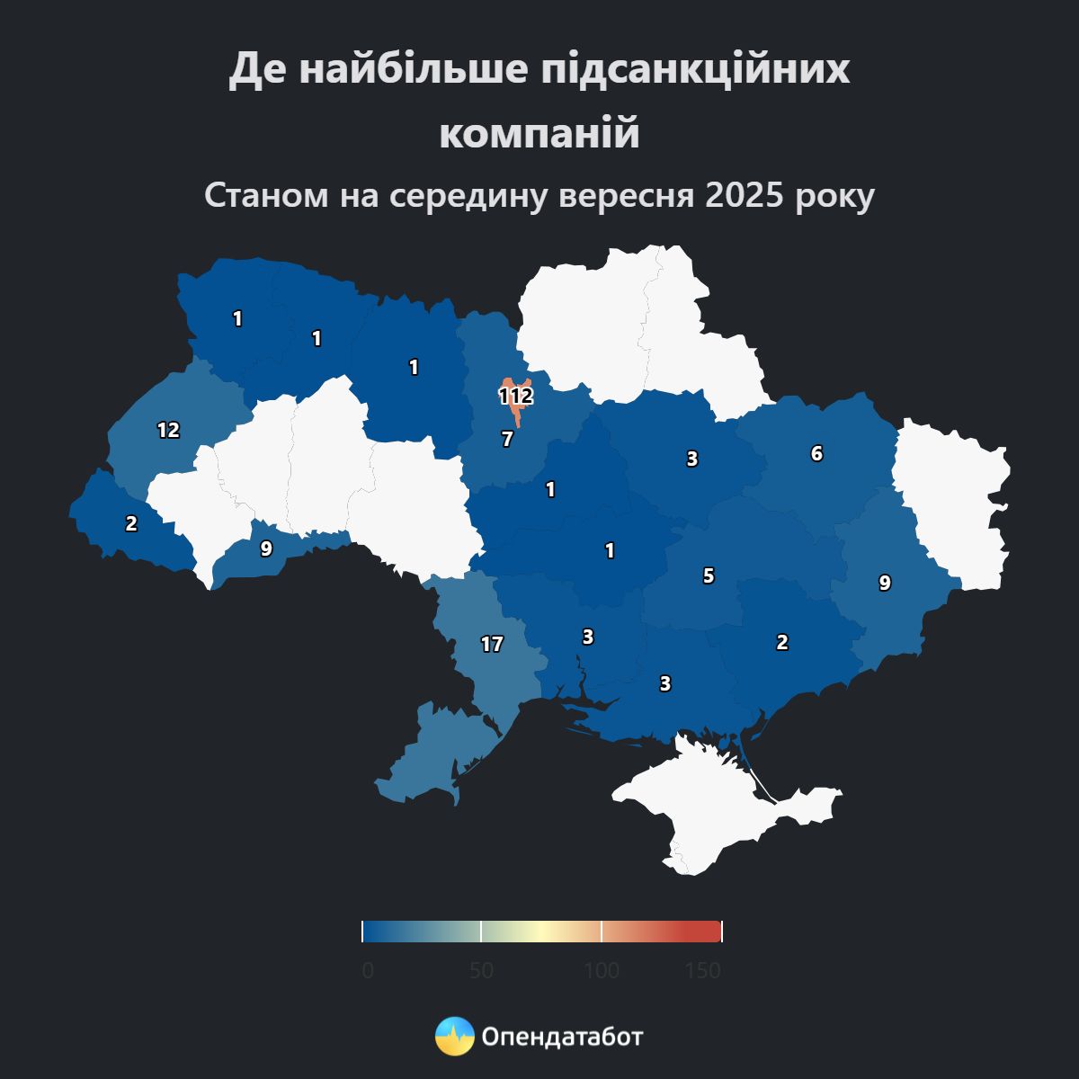 Загалом понад половина компаній, які нині перебувають під санкціями, зареєстровані у Києві – 112 підприємств. Для порівняння: в Одеській області таких 17, у Львівській – 12, у Чернівецькій та Донецькій – по 9.