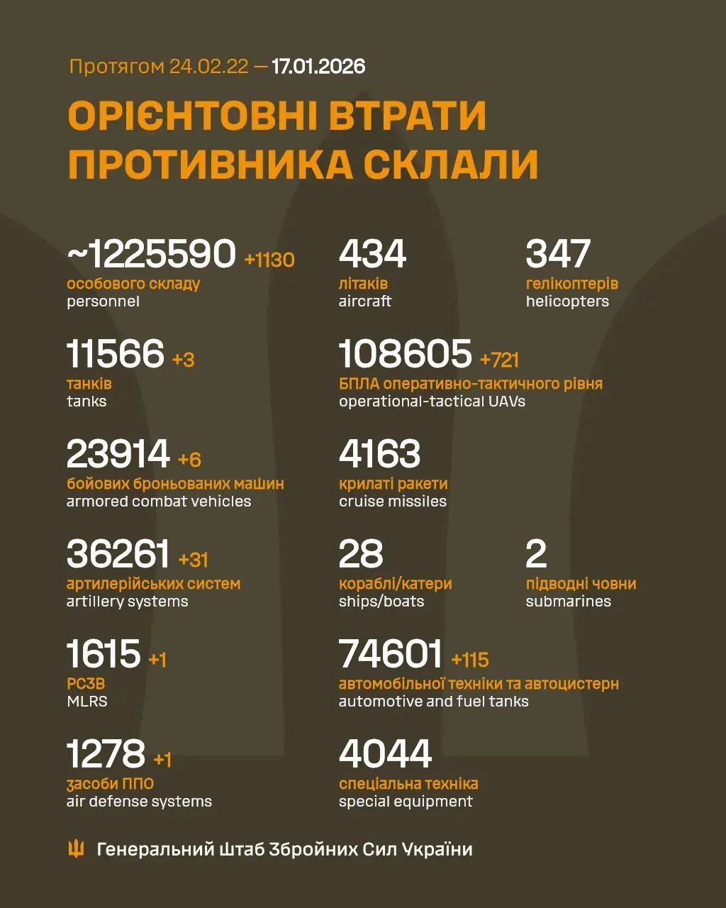 У ніч на 17 січня противник атакував Україну 115 ударними БпЛА типу Shahed, «Гербера», «Італмас» та іншими дронами з території рф і тимчасово окупованих районів.